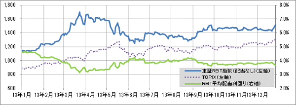 <東証REIT指数と分配金利回りの推移> (グラフは2013年1月~12月の12ヶ月間)