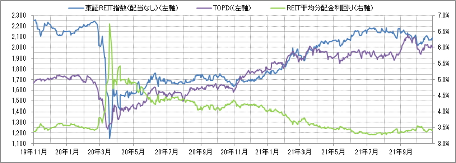 REIT指数と予想分配金利回りの推移>  (グラフは2019年11月~2021年10月の24ヶ月間)