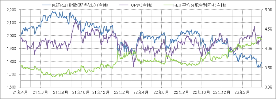 REIT指数と予想分配金利回りの推移>  (グラフは2021年4月~2023年3月の24ヶ月間)